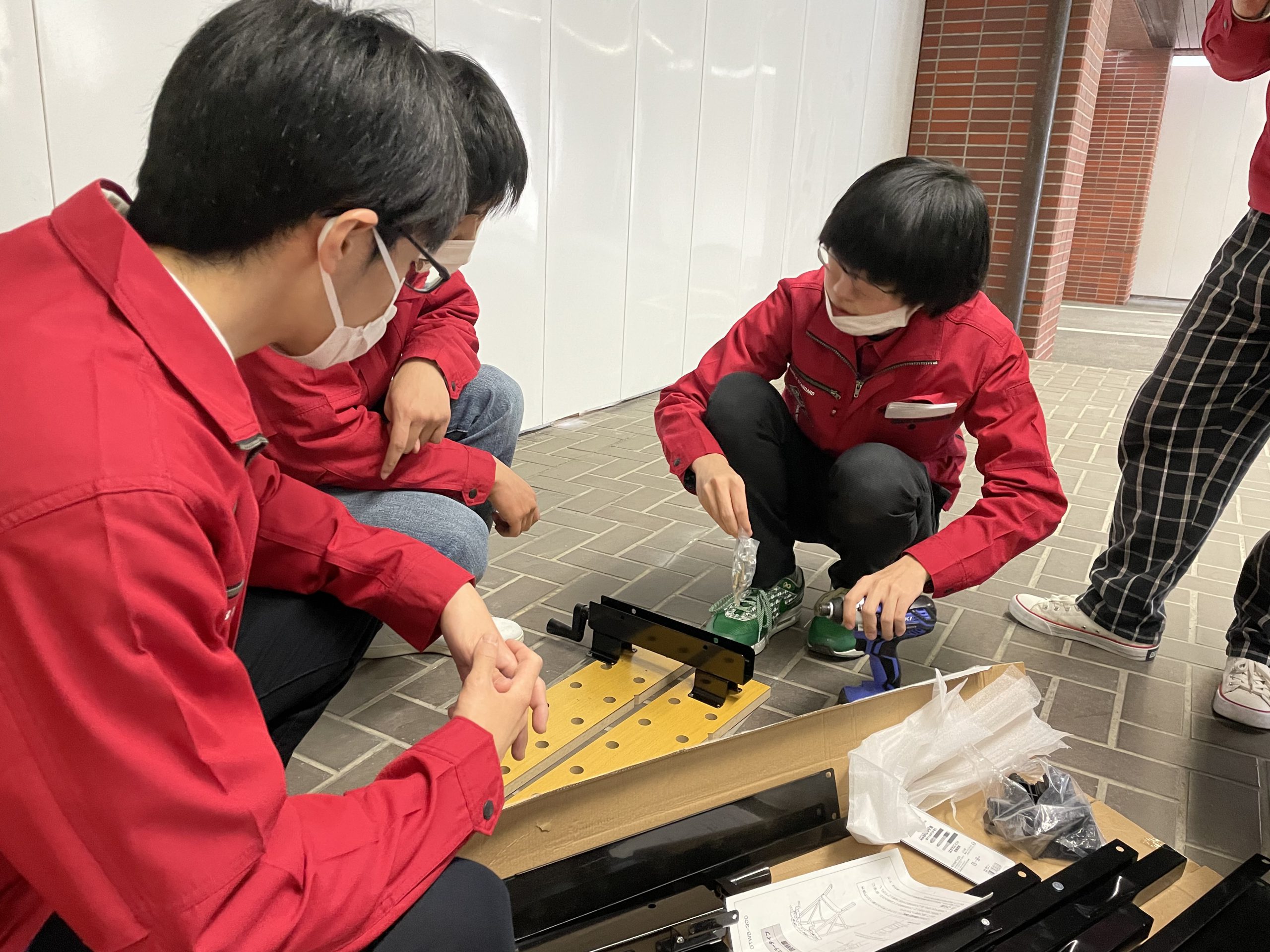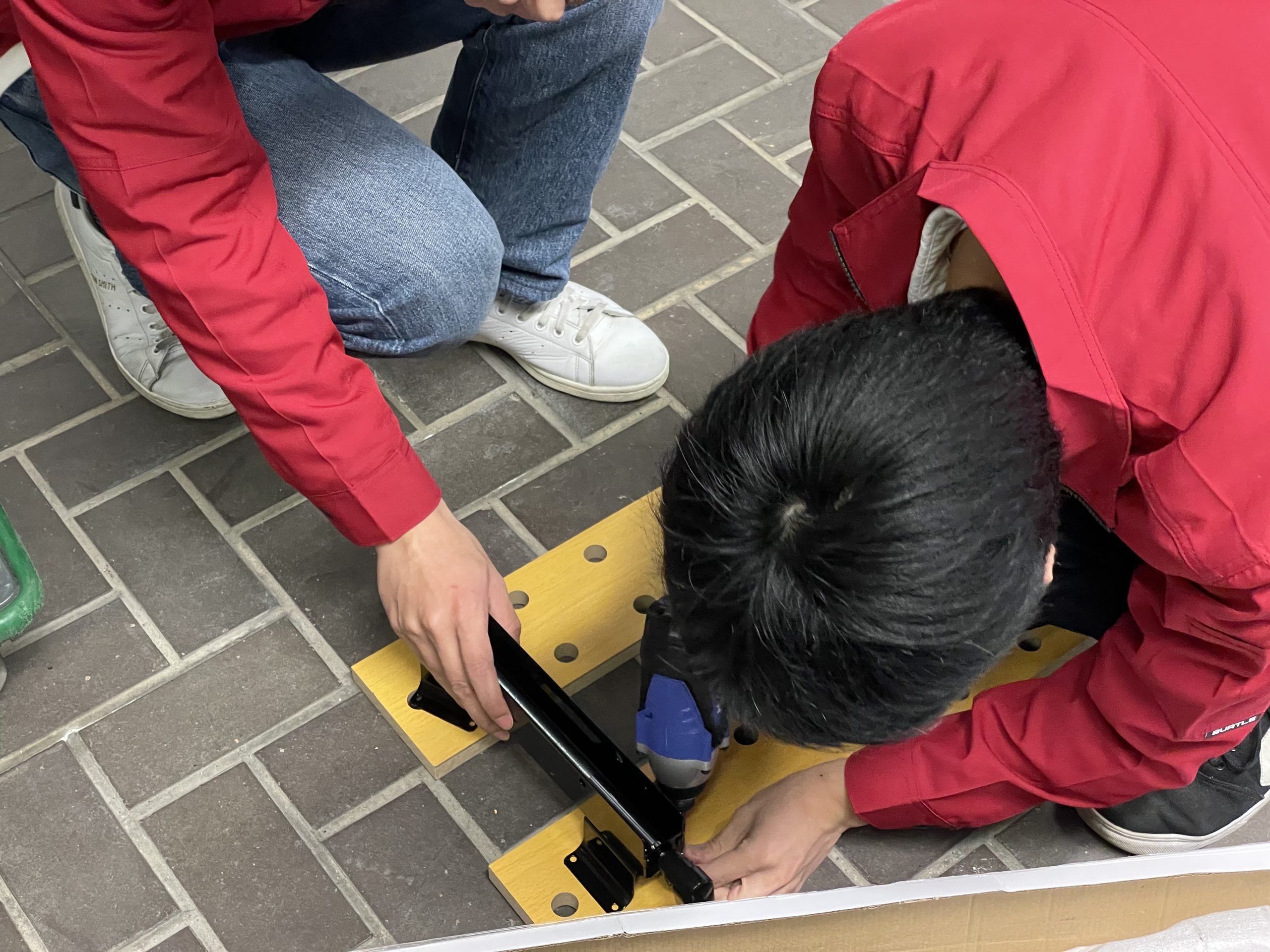 その後、1年生のメンバーに電動工具を使ってワークベンチの組み立てを行ってもらいました。