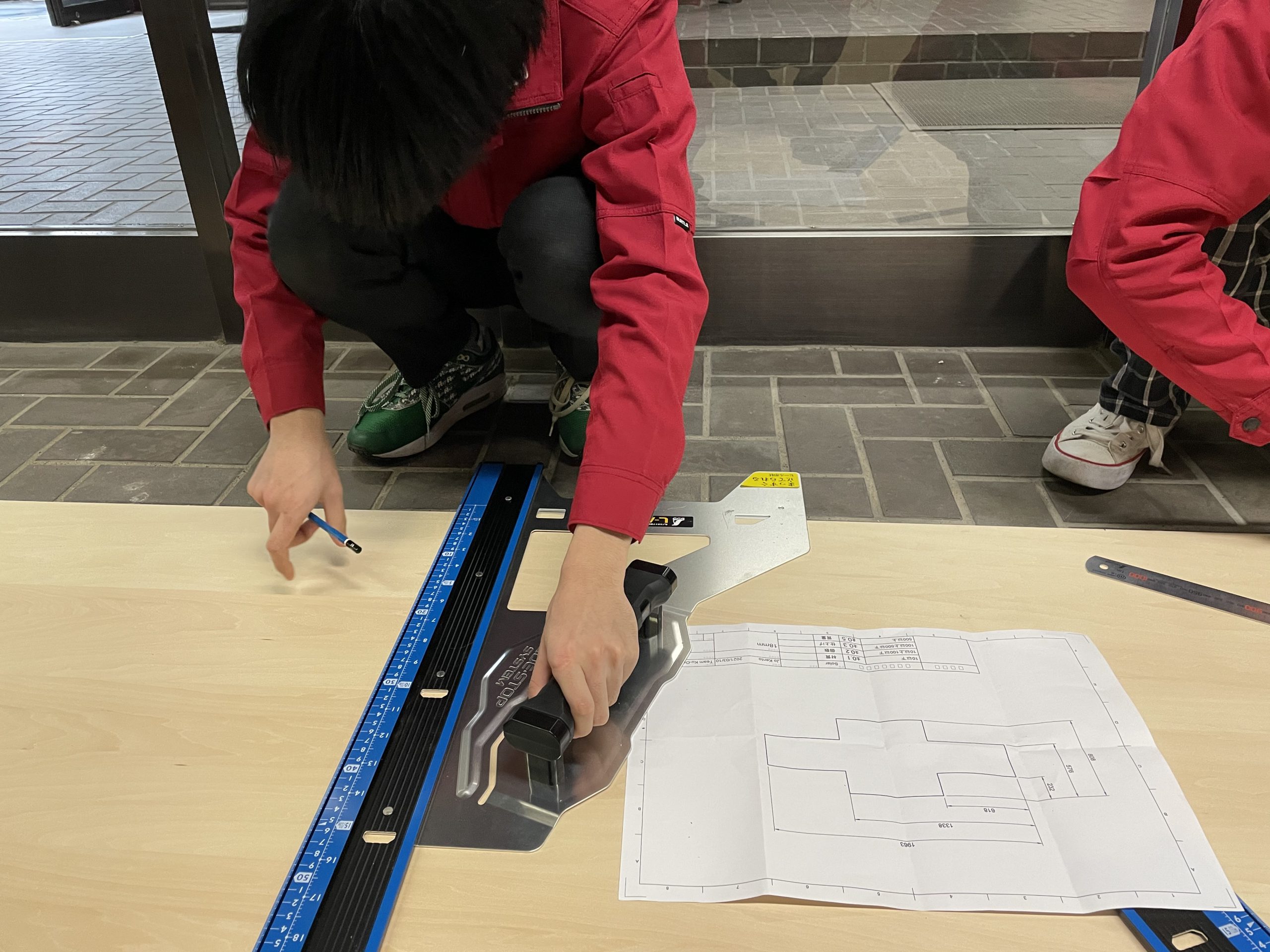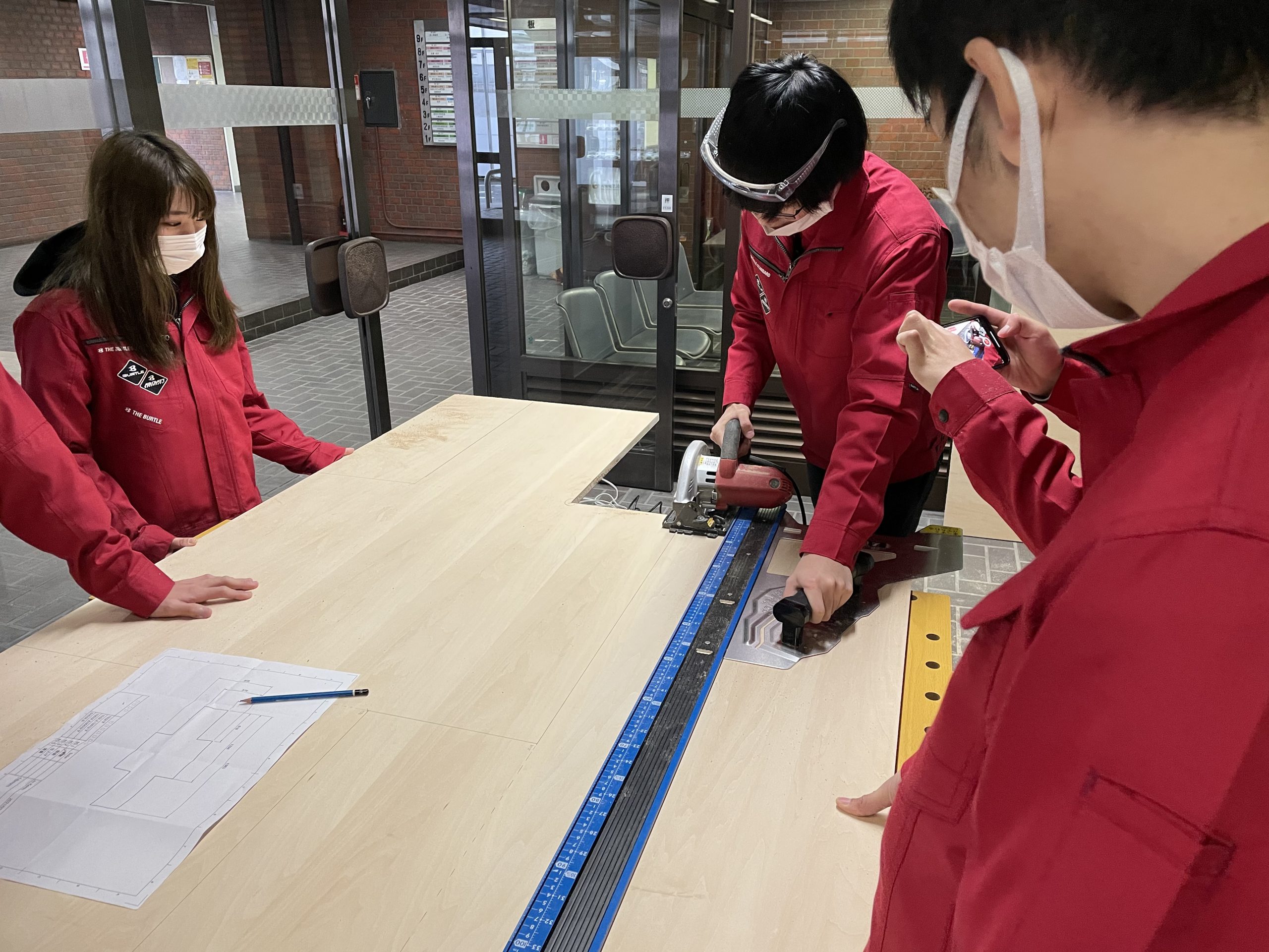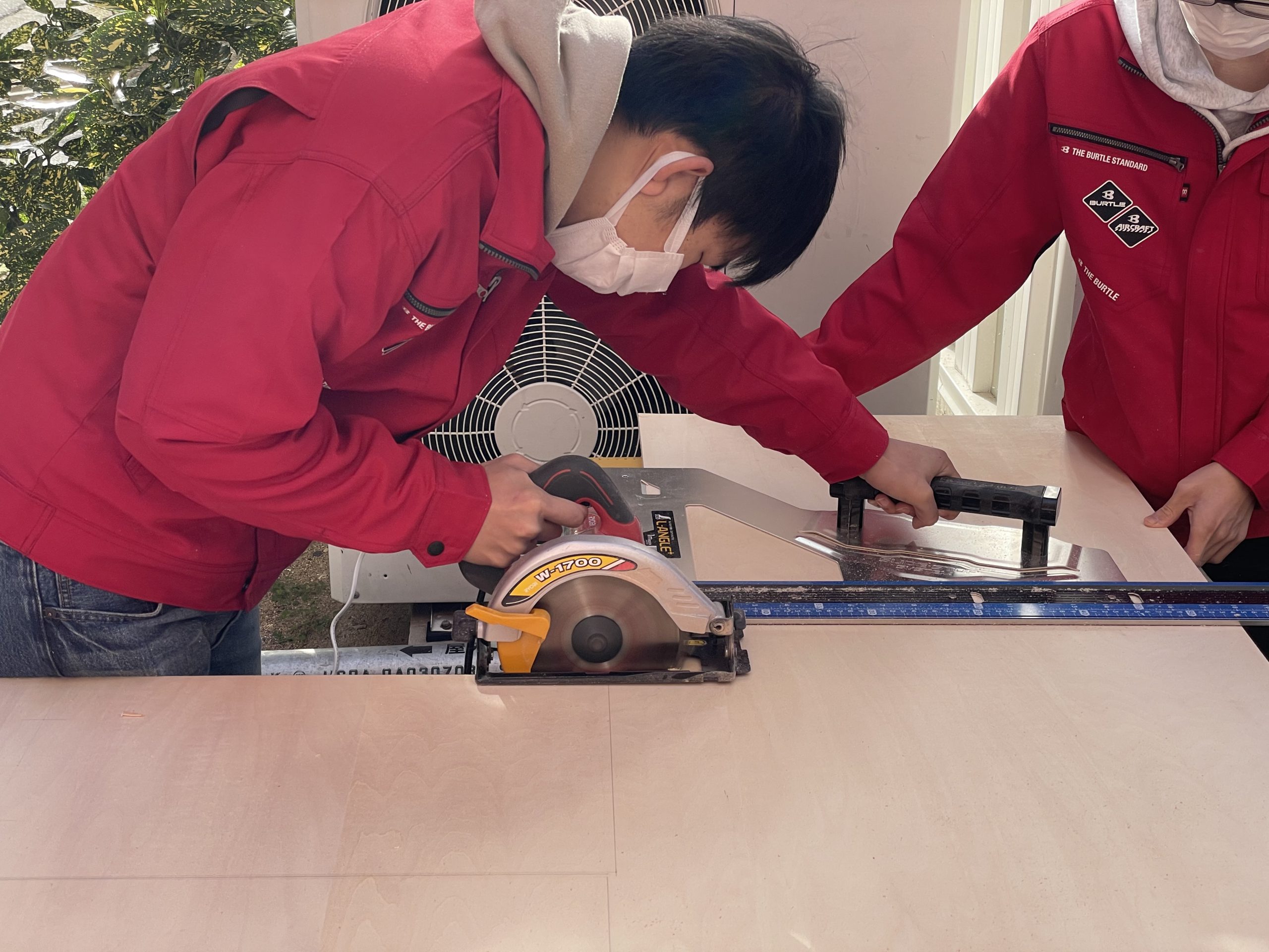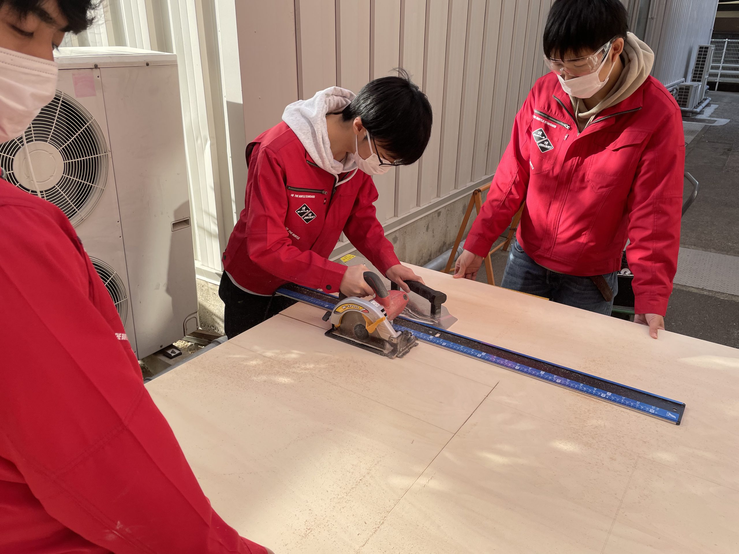 CADで設計したとおりに合板にケガキを行い、丸鋸やジグソーなどでパーツの切り出しを行いました。