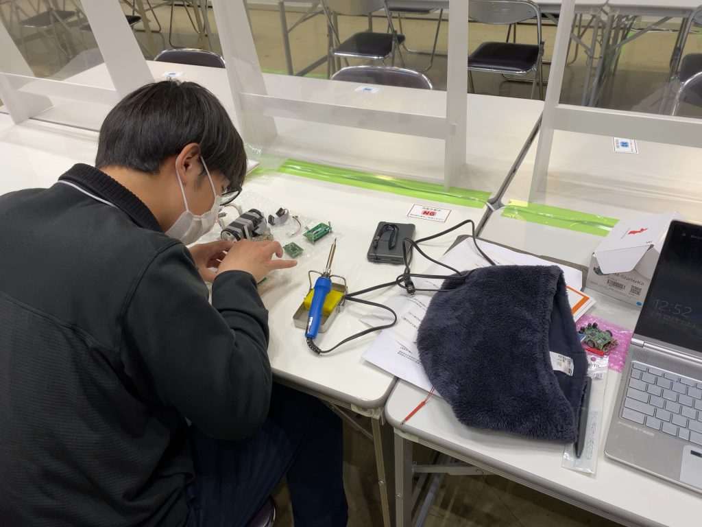 会場の控え室ではんだごてを握るメンバー