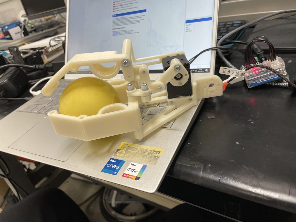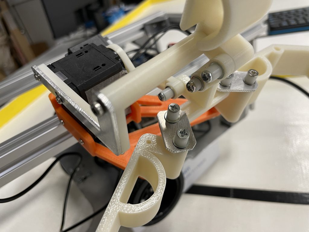 上記の写真に写っているものが今回新しく作成したアームです。前回作成したアームと違う点は旧式は二カ所の稼働でアームを取っていたのに対し、新作は三カ所稼働で取ることでより安定してボールを取ることが出来ます。